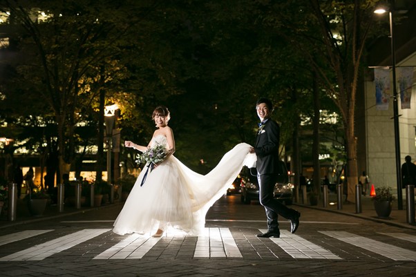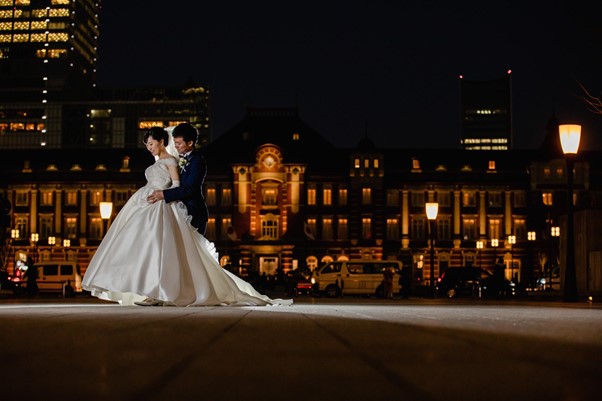 東京駅のあたたかく煌びやかな背景をバックに撮影です