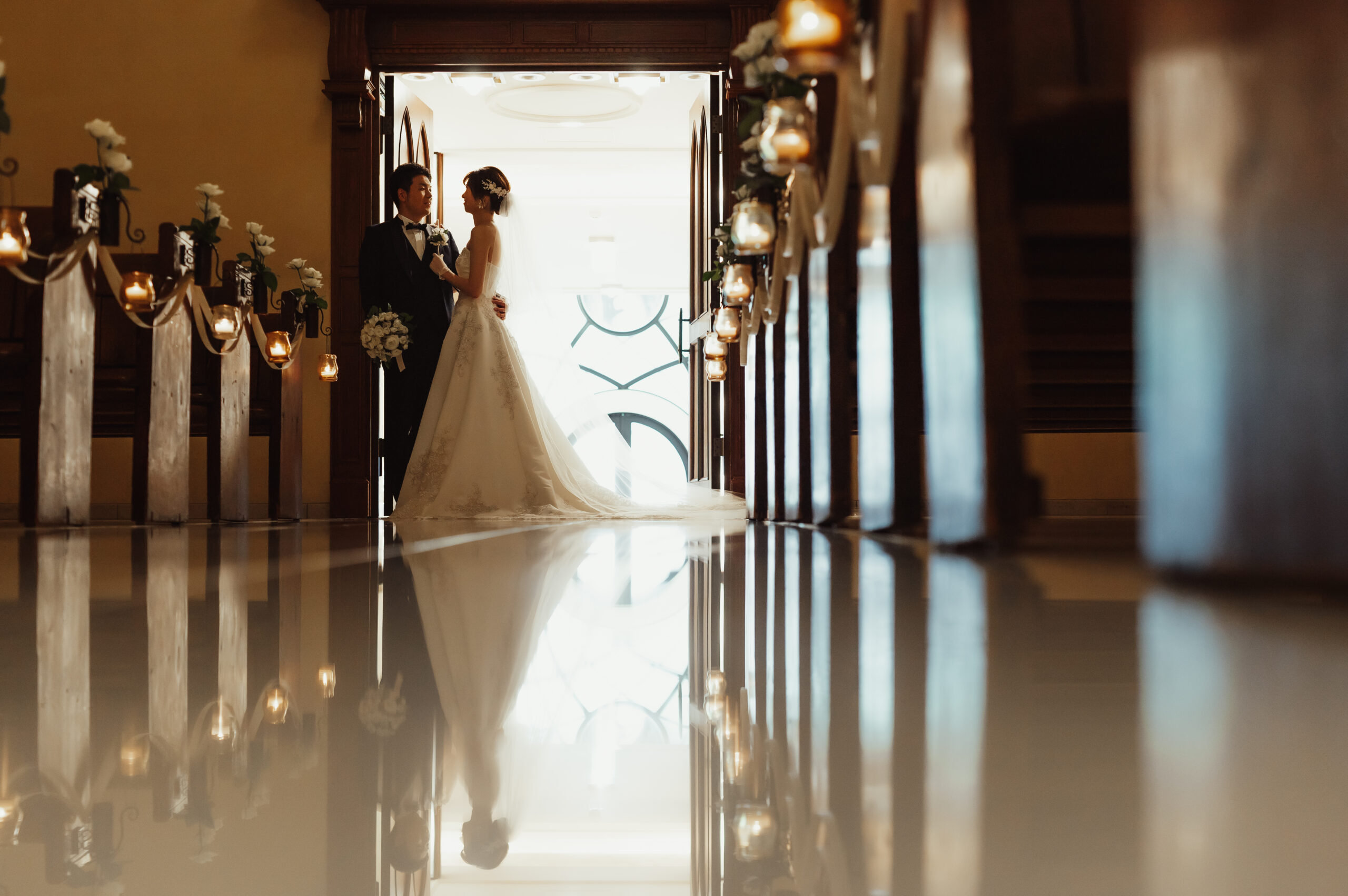 バージンロードに反射しているお写真は扉の前からでも綺麗なんですよ。