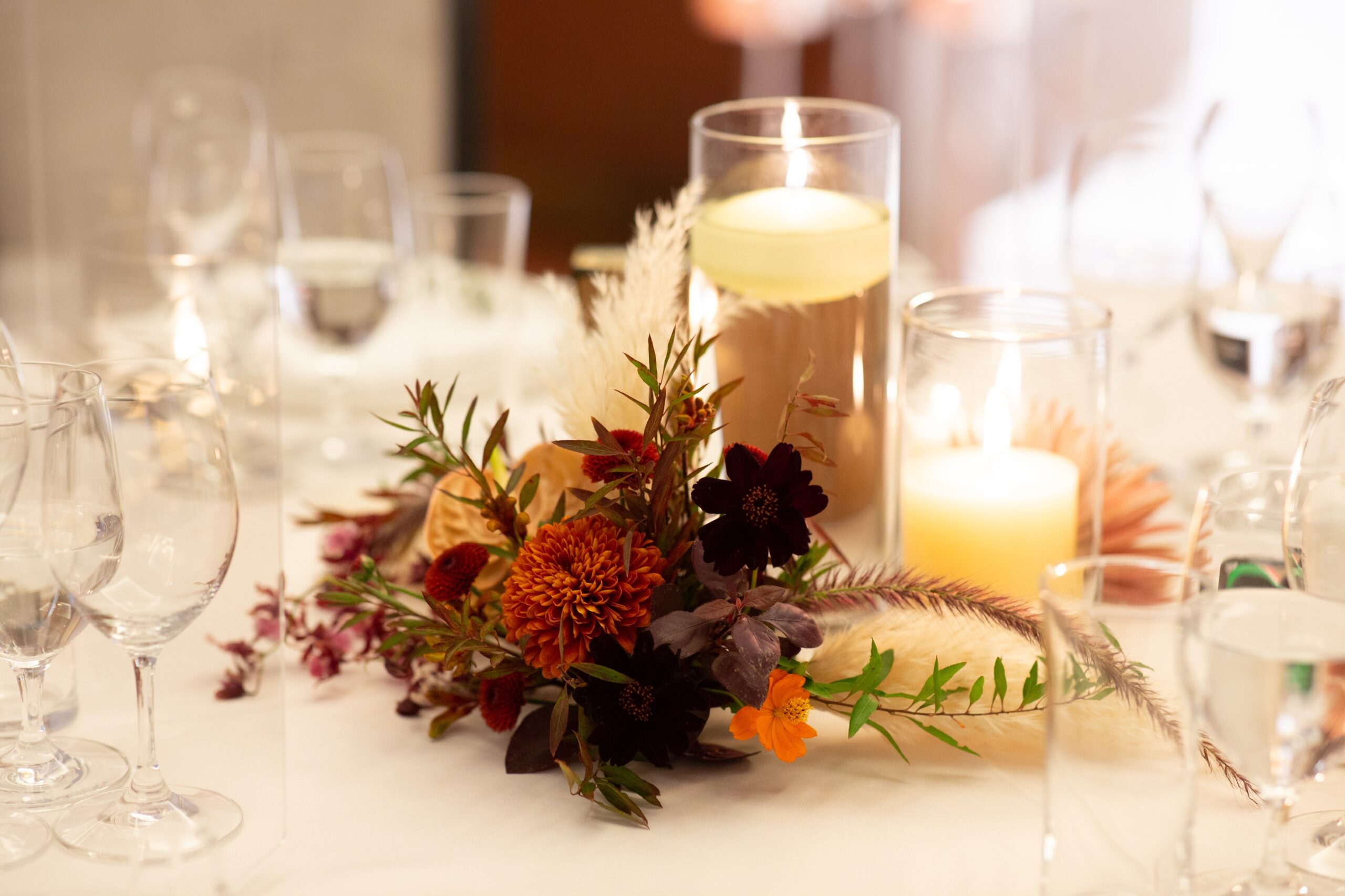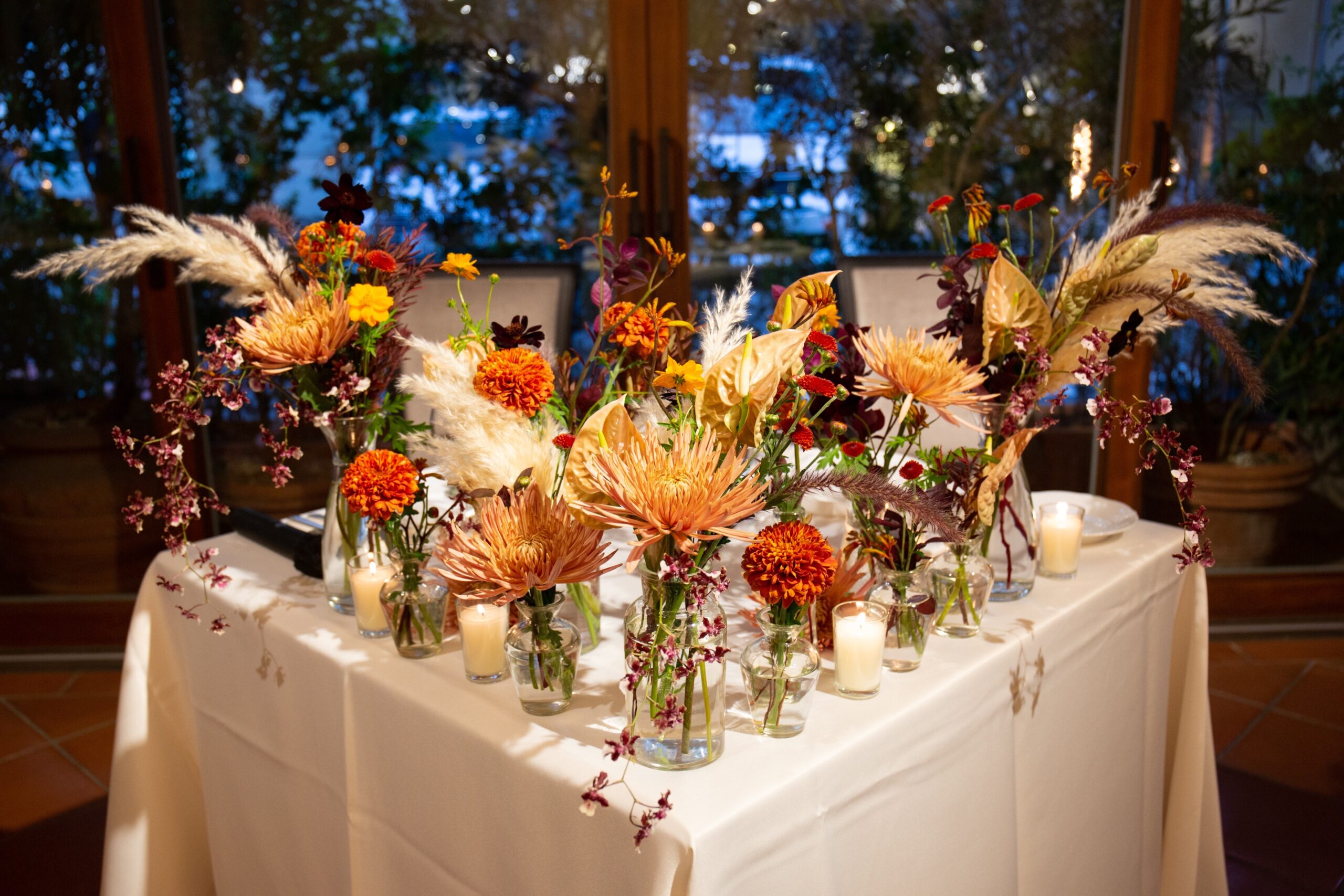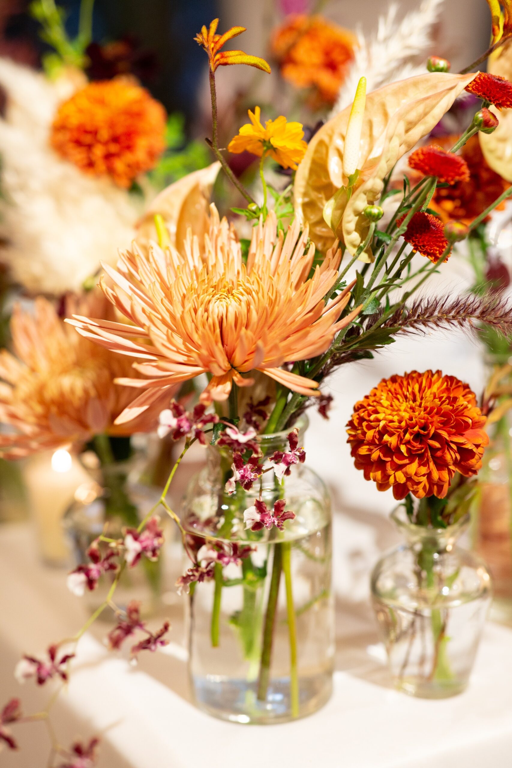 オレンジやブラウンのお花はバラやマムをはじめ、