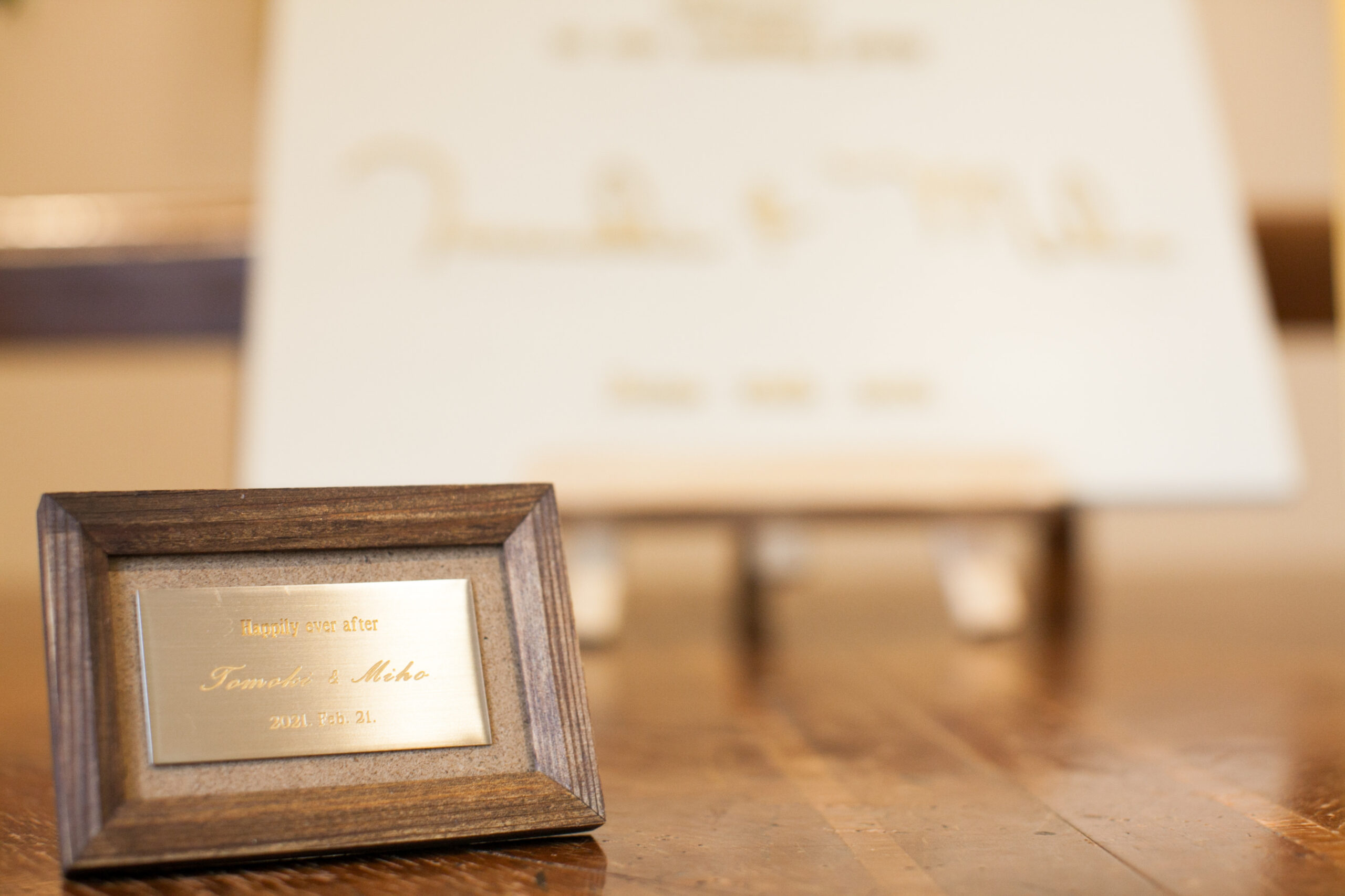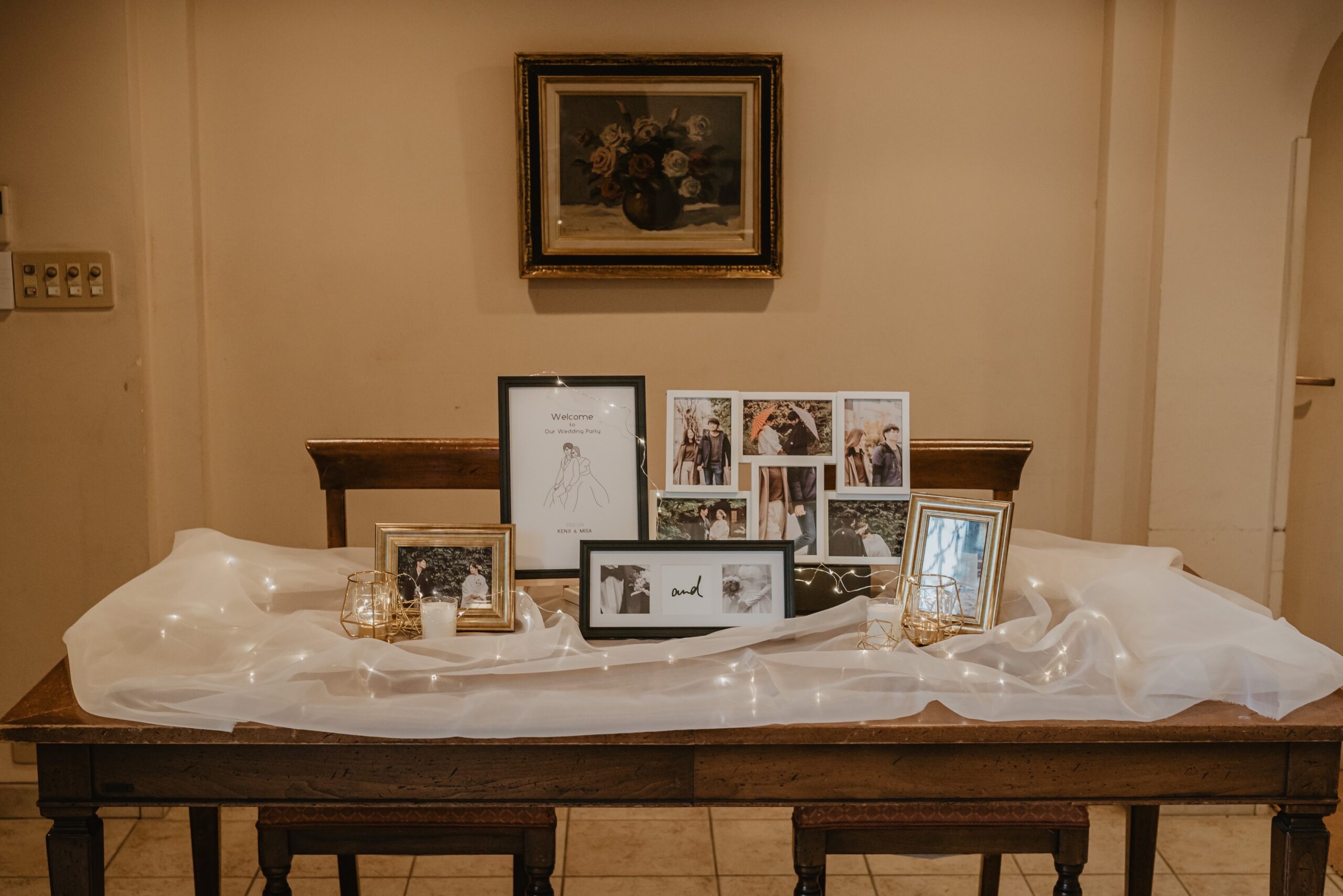 前撮りの写真やオリジナルのウェルカムボードをチュールの上にコンパクトに