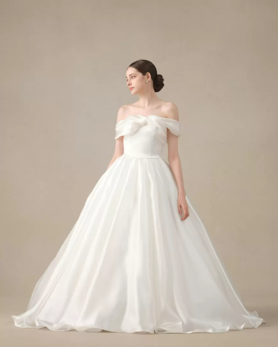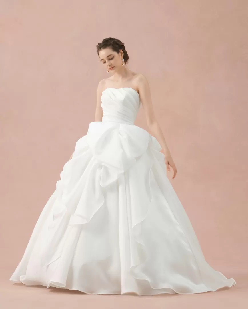 ネックラインはツイストドレープで、ダーツを組み合わせた3Dスカートは朝顔が花開いたようなシルエットです。
