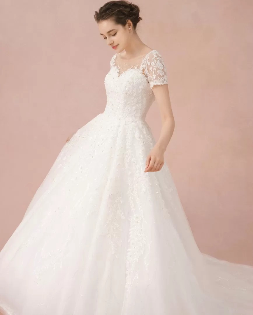 ビジューが輝きを放つスイートを叶える半袖マリエです。
