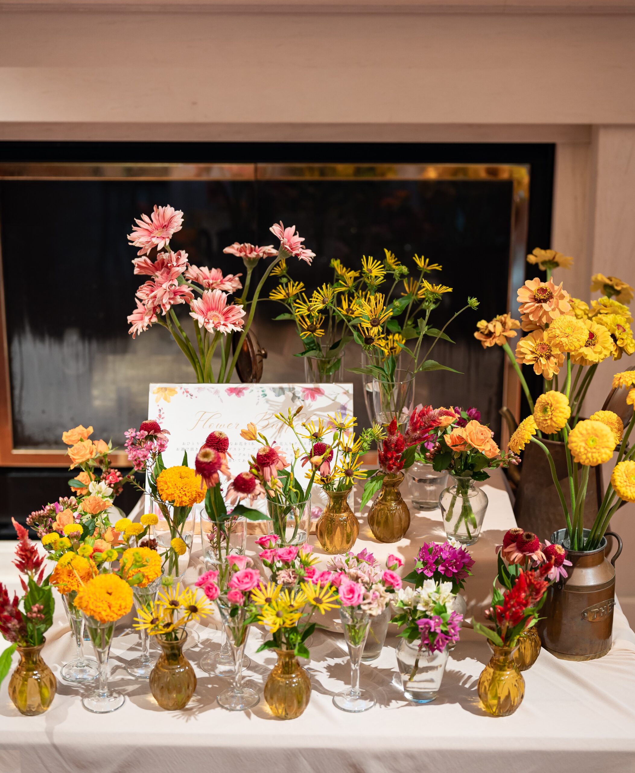 たくさんのお花が用意されているビュッフェ台からお好きなお花をお1人ひとつ選んでいただき、ゲストご自身のテーブルに装飾していただきます