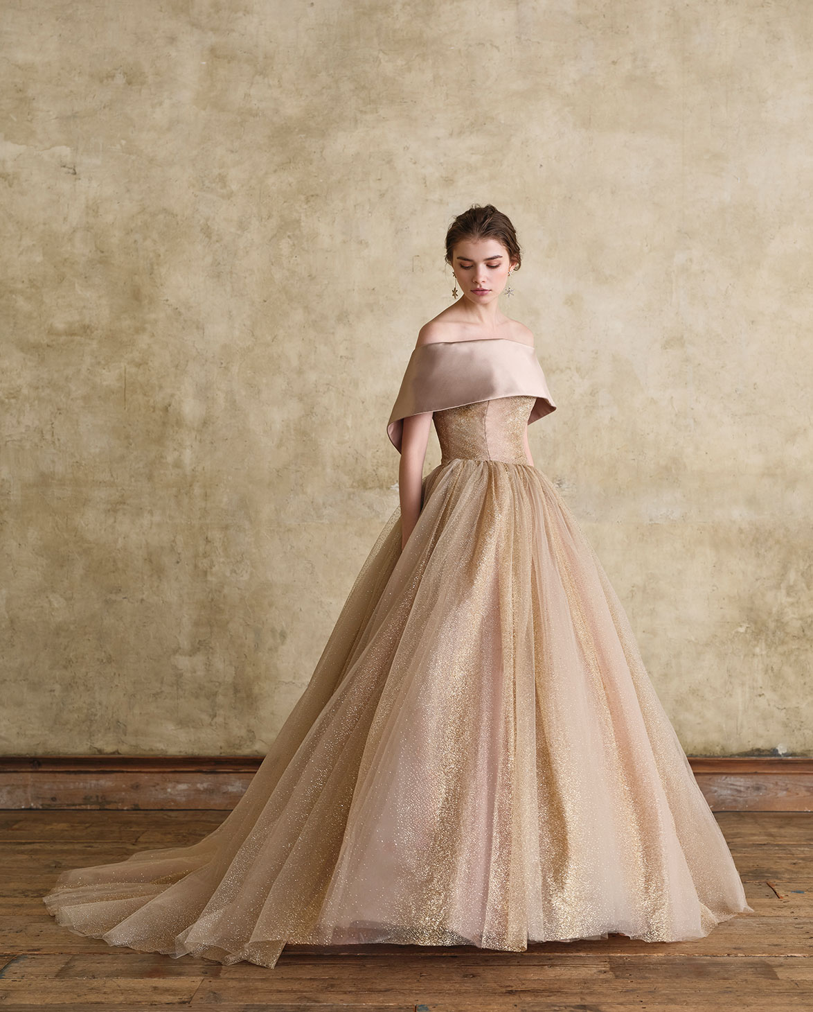 ゴールドグリッターの輝きが美しく、夏の陽ざしにも秋の穏やかな空にも似合う1着です