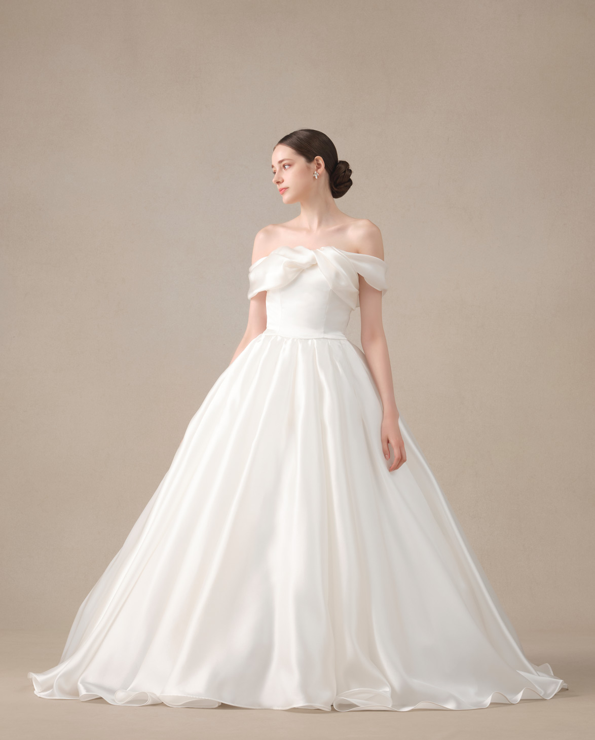 つぼみのねじれがほどけるようなイメージのツイストドレープのネックラインがアクセント