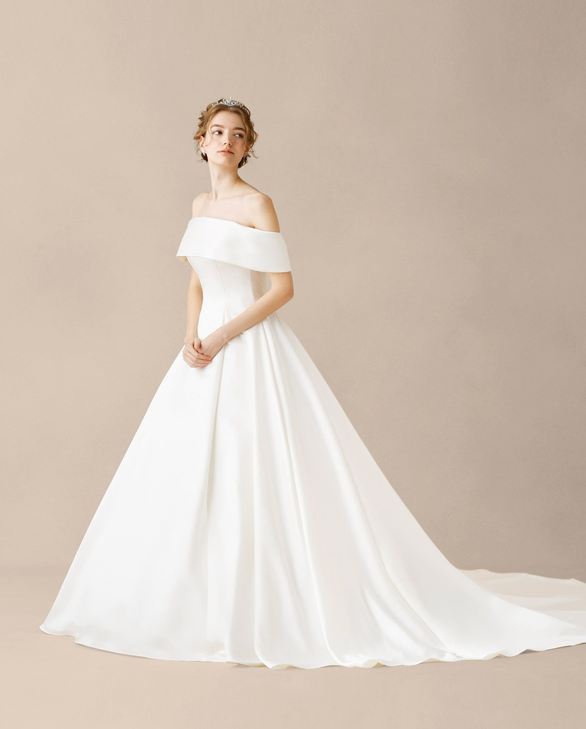 なめらかなサテン生地ですっきりと美しく仕立てたプリンセスラインのドレスです