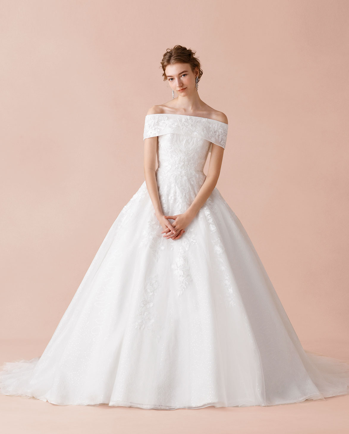スパンコールを施したラッセルレースをドレス全体に使用することで どの角度から見ても主役にふさわしい煌めきと存在感を与えてくれます