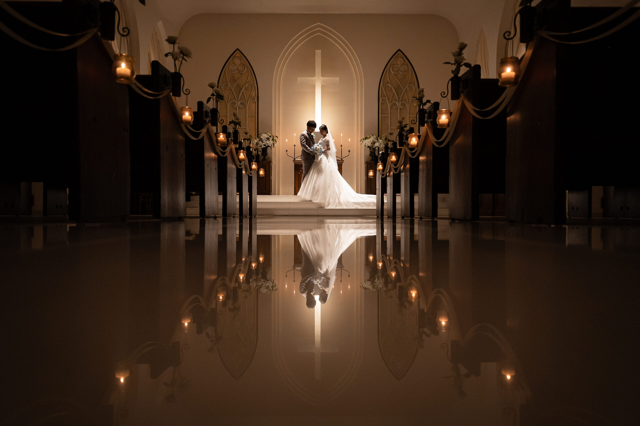 教会見学の際に カメラマンが私服のおふたりを1カット撮影し