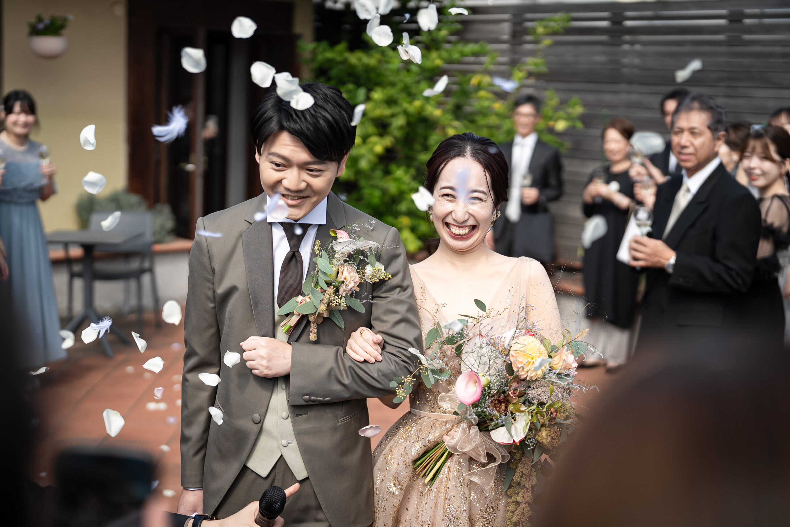 お祝いのフラワーシャワーの花道をとおり、新郎様・新婦様のご入場です!