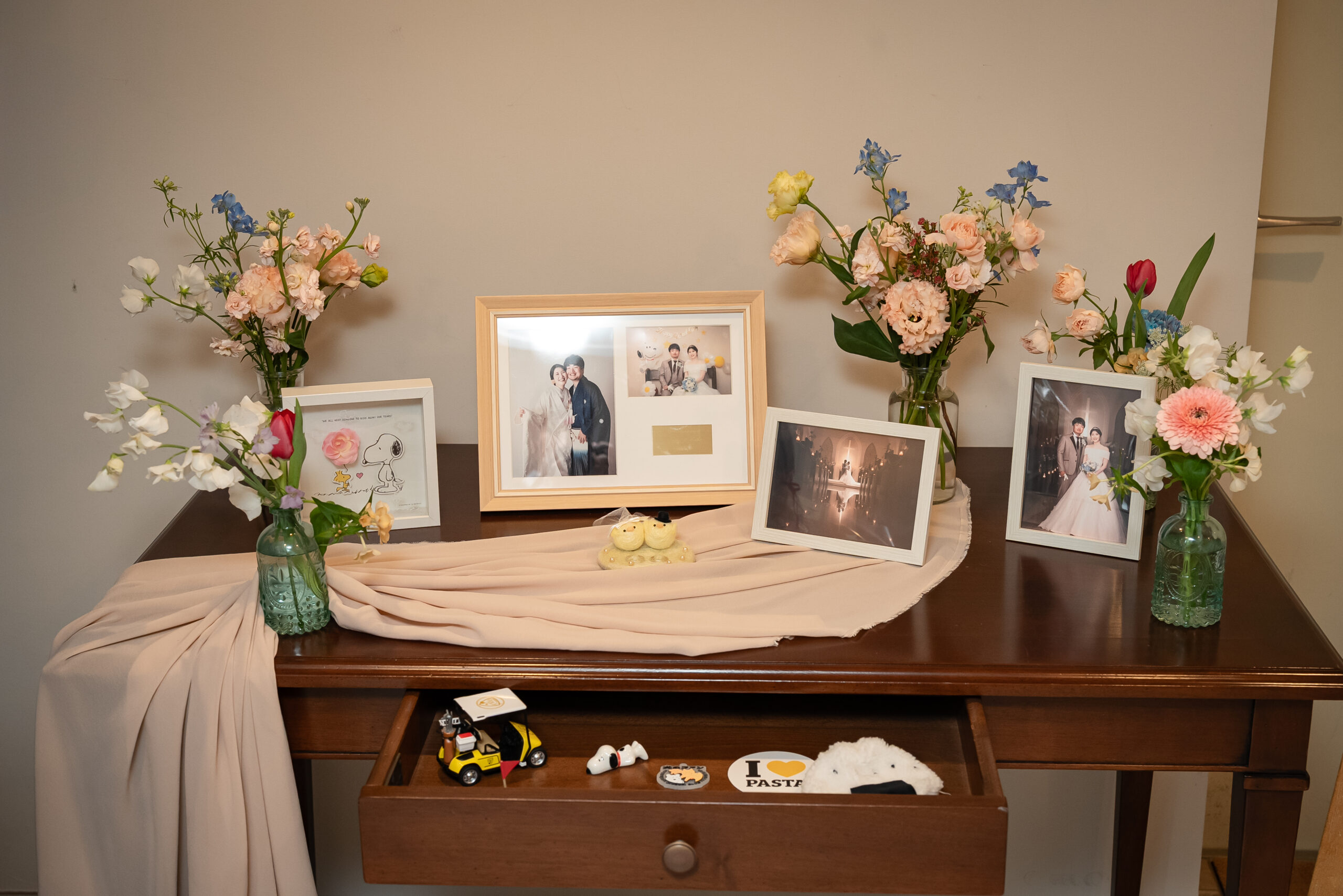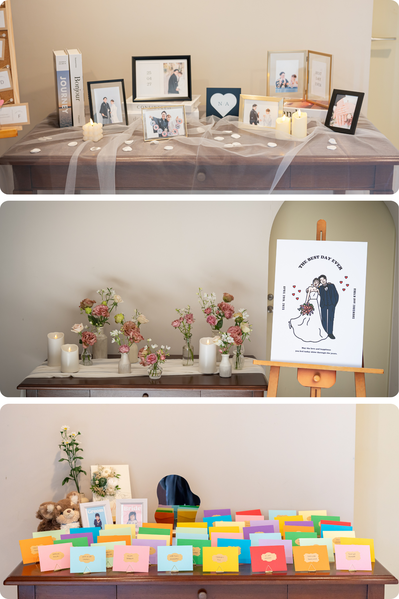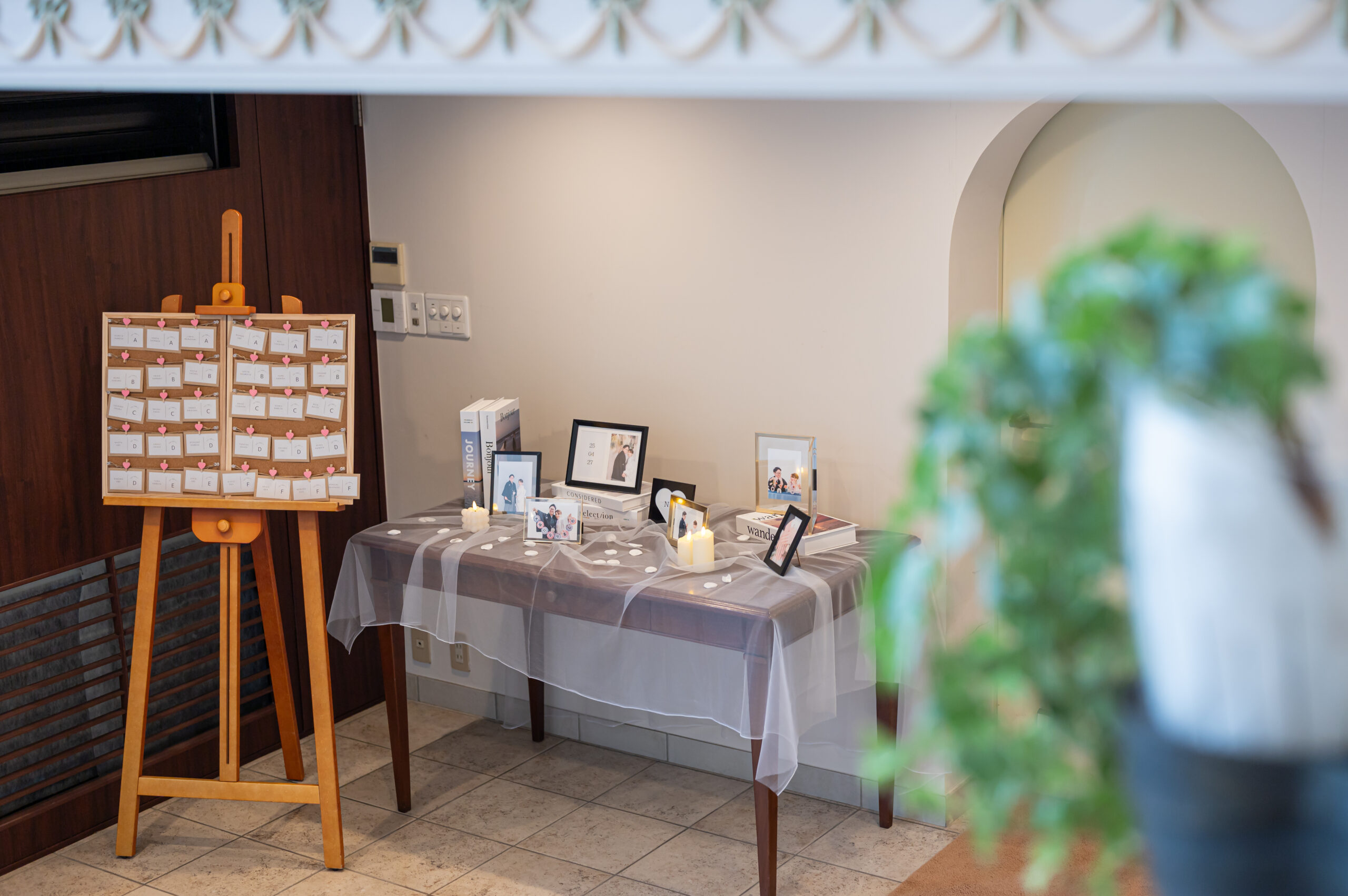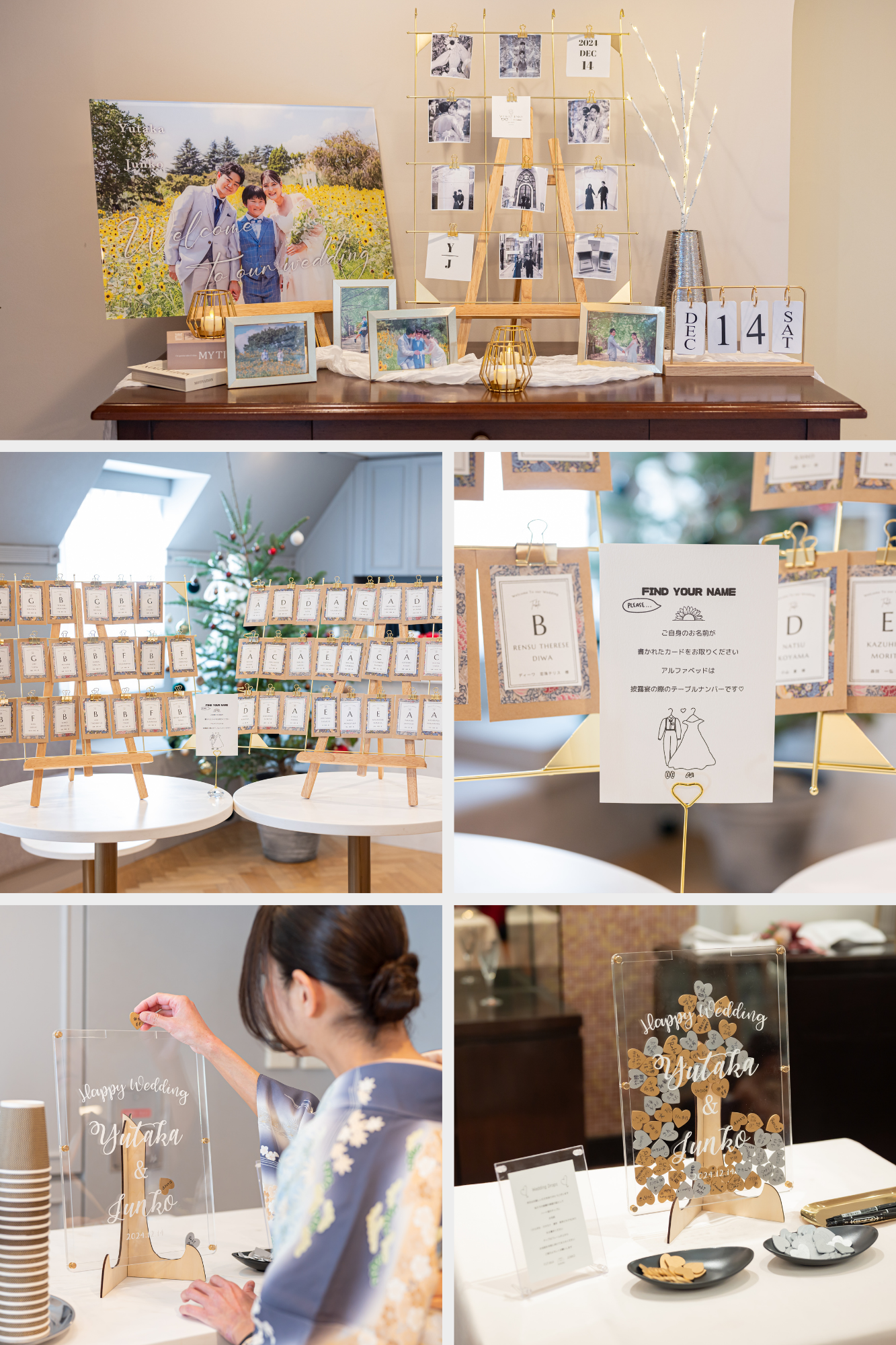 思い出のお写真のほか、お手紙、エスコートカード、ゲスト参加型の結婚証明書を置く事も可能です♪