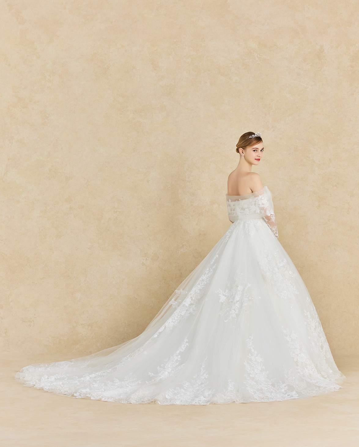 チュールに繊細なレースを配したケープは、ほどよい透け感でデコルテ周りを優しく包みこみます