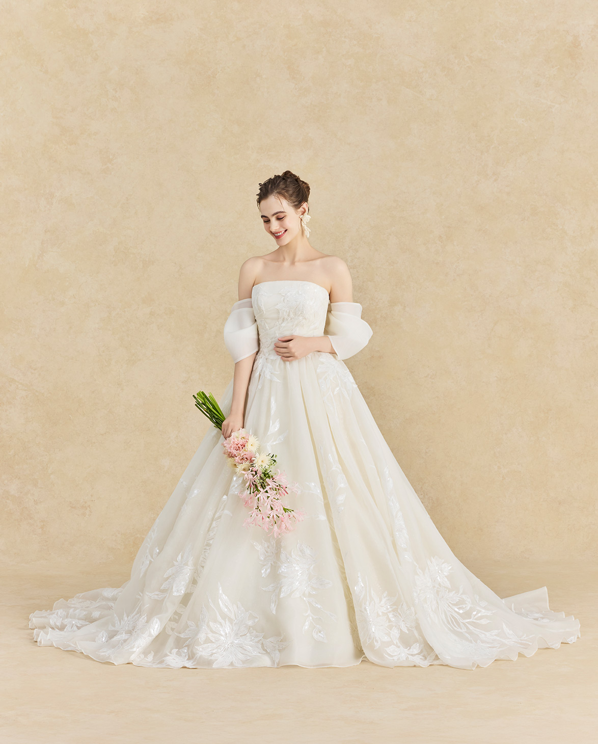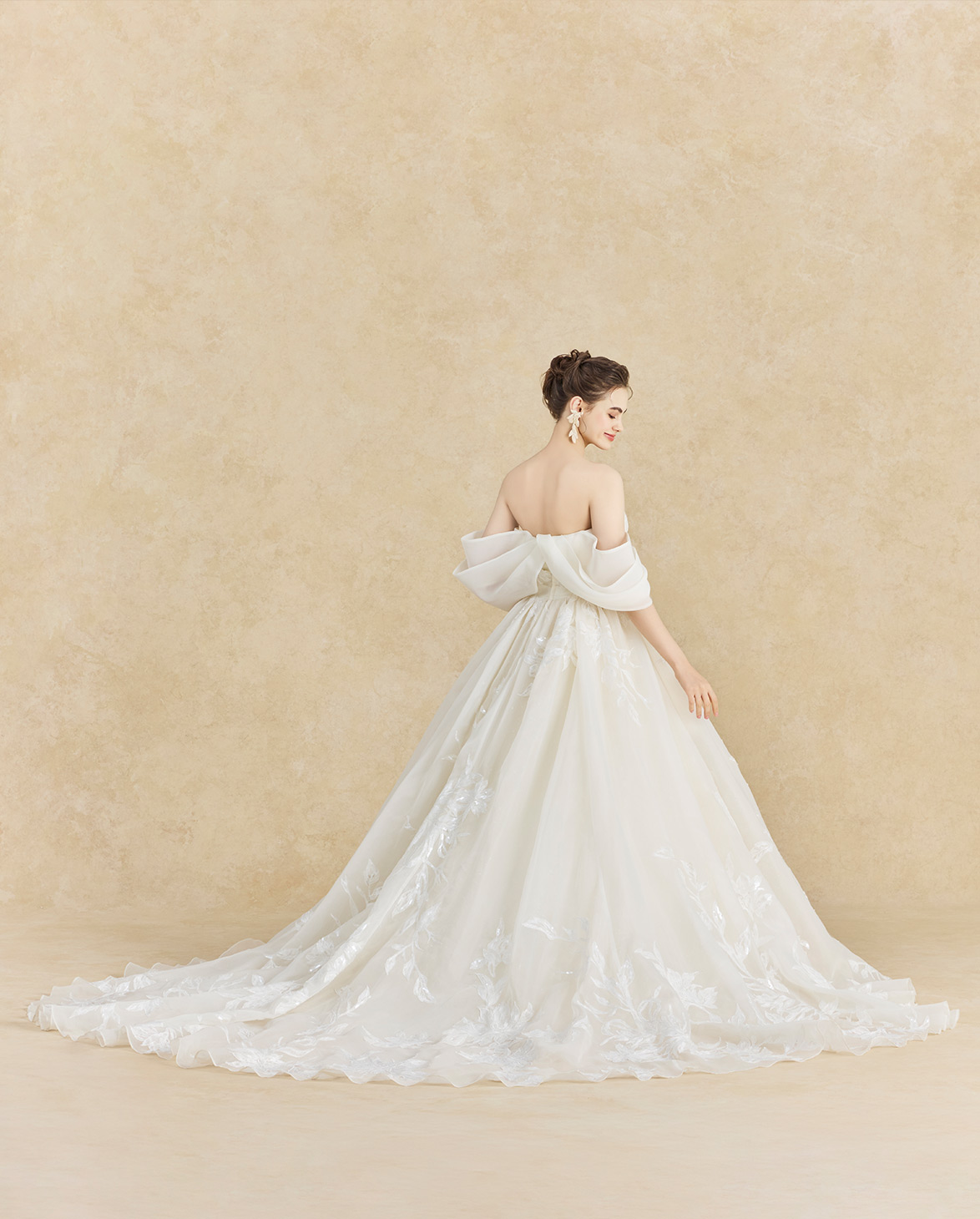 全体に施された可憐な花柄のエンブロイダリーレースが、会場のどこから見ても美しく浮かび上がる、フォトジェニックな1着です