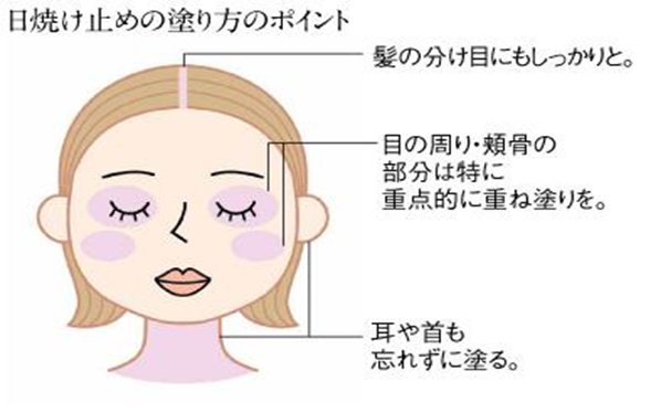 (2)外線に敏感な人や、日焼けしやすい肩・胸・額・鼻・ほお骨などの部位は、状況に応じてつけ直す。